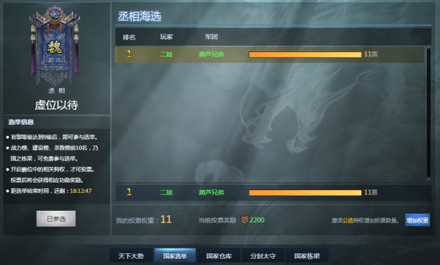 提到国王,就不得不提及特殊的国王选举机制,本国内的全官邸达到9级的玩家均有国王的选举权和被选举权,玩家能够选择毛遂自荐也可以推优择士。选举以投票形式进行,投票后可以得到一定的功勋奖励