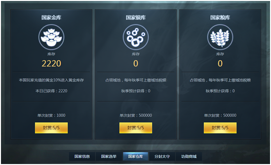 国王拥有国家仓库资源的封赏权,能够快要要黄金,银两,粮食等封赏给指定的军团。