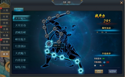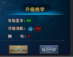 消耗真气迭代绝学,获得属性加成。当上一级绝学升满级时,便能够革新更高等级的绝学!。