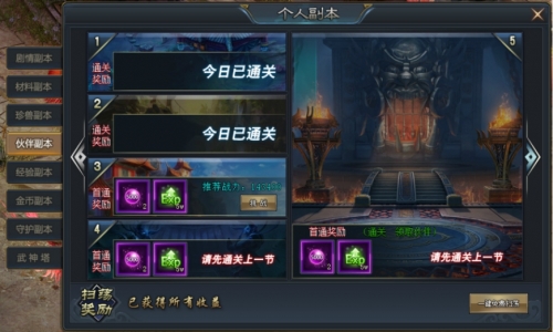 伙伴副本每一章分为五节,每通关一章即能够够获得一位伙伴作为奖励,每个副本每天足以使用1次,首通之后可获得许多伙伴修为丹奖励,通过之后能一键扫荡,直接获得奖励!
