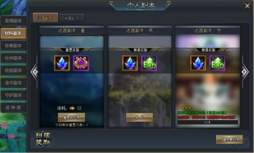 资讯副本包括:法器副本与神翼副本,每个副本又分为壹、贰、叁……共十个等级,每天每个副本能够使用1次。挑战后消耗元宝可以重置并扫荡,并返还绑定元宝。因为难度系数的不同,开启件也跟玩家的等级有关。