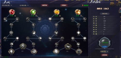 通过野外挂机和侠客副本可提取天赋经验由于此进步天赋等级获得天赋点数。投入不同系的天赋能够获得不同的属性加成乃至buff加成。