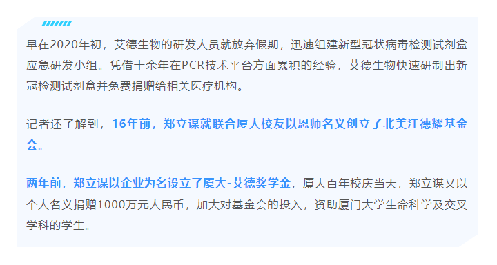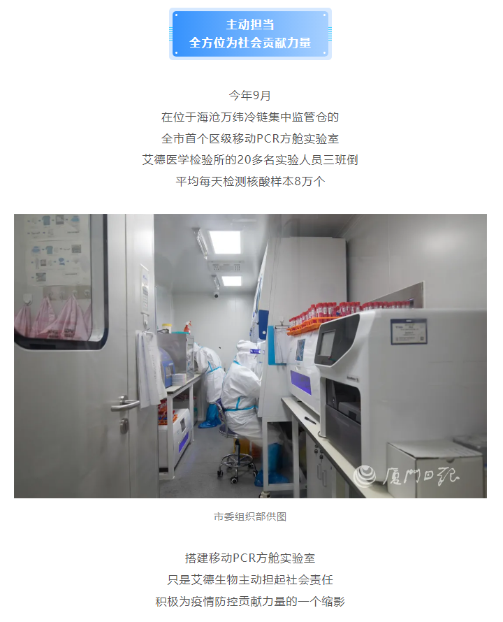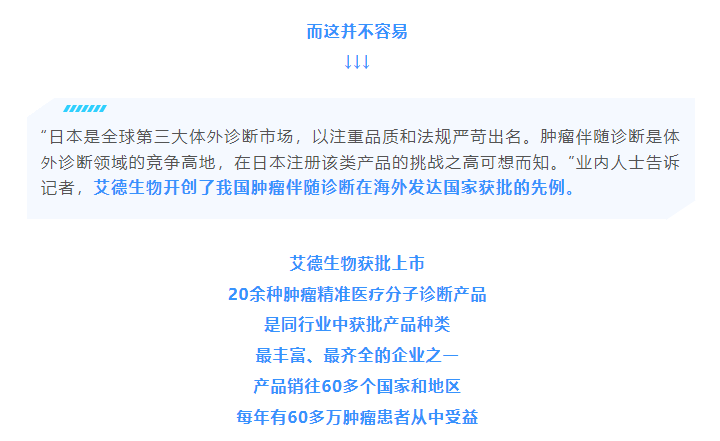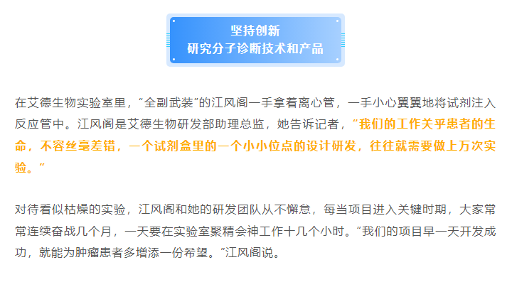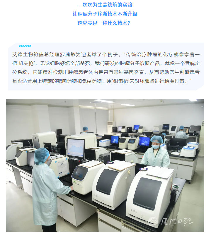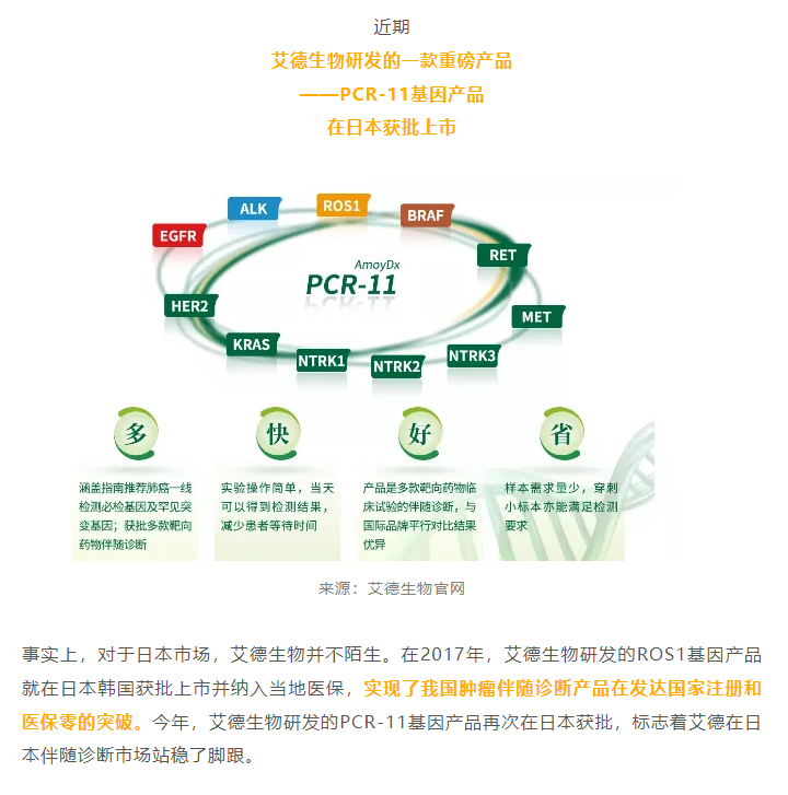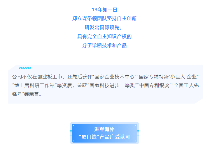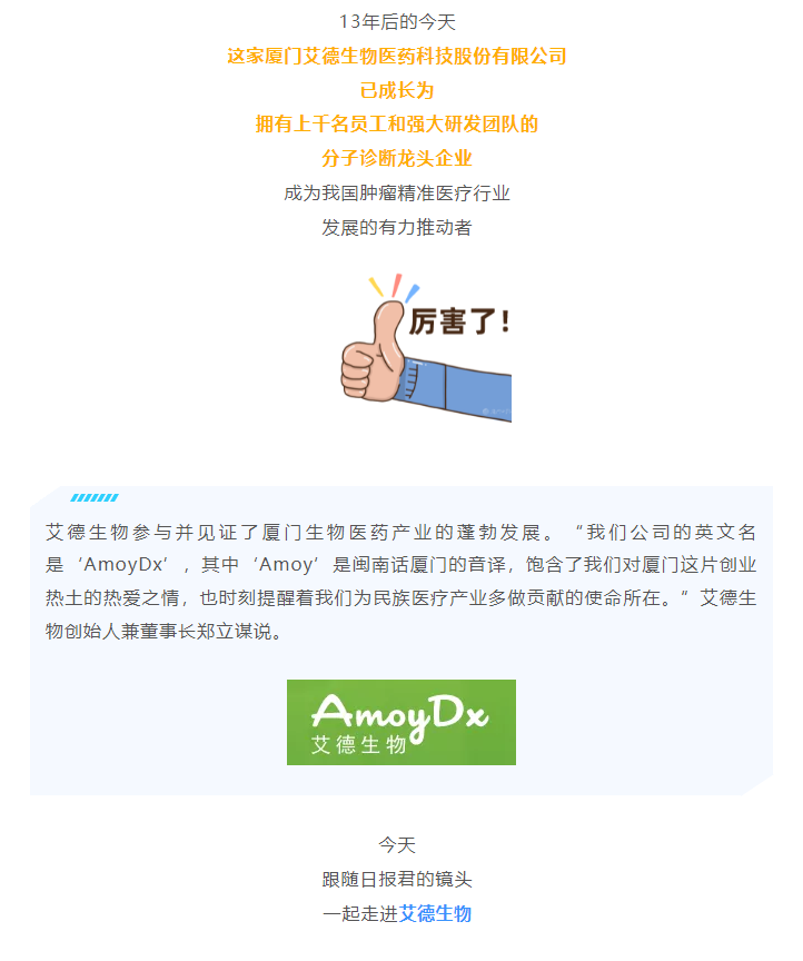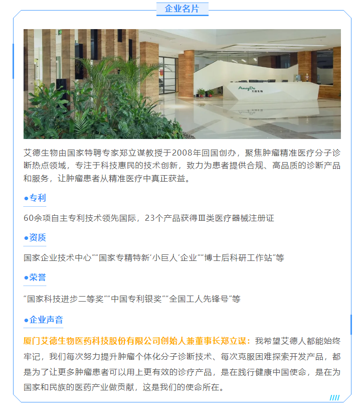 厦门艾德生物医药科技股份有限公司(股票代码:300685)聚焦在肿瘤精准医疗分子诊断领域,专注于科技惠民的技术创新,致力为患者提供合规、高品质的诊断产品和服务,让患者从精准医疗中真正获益。公司拥有国家企业技术中心、工信部专精特新小巨人企业、国家级制造业单项冠军企业、博士后科研工作站、发改委基因检测技术应用示范中心、国家高新技术企业、福建省肿瘤高通量测序工程研究中心等资质,GMP标准厂房获得国家药监局(NMPA)和欧盟ISO13485资质认证;公司拥有ADx-ARMS®、Super-ARMS®、ddCapture®、ADx-HANDLE®等核心技术,核心技术获得中国、美国、欧盟、日本授权,荣获国家科学技术进步奖二等奖、中国专利奖银奖;公司产品覆盖具备精准医疗条件的各大癌种,多个产品至今尚无竞品,除了在国内三甲医院大规模应用外,部分产品在日本、韩国获批上市并进入当地医保,开创了我国肿瘤伴随诊断海外获批的先例。此外,公司下设厦门艾德医学检验所、上海厦维医学检验所,拥有医疗机构执业许可证、通过美国病理学会(CAP)认证和ISO15189认可,专业从事第三方临检服务。目前全球数十个国家和地区的客户选择了艾德产品和服务,每年有数十万肿瘤患者从中受益。此外,公司瞄准行业创新源头,以伴随诊断赋能原研药物临床,是众多顶级药企肿瘤药物开发的战略合作伙伴,是国际知名的民族品牌。